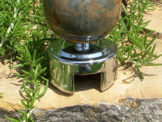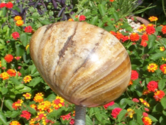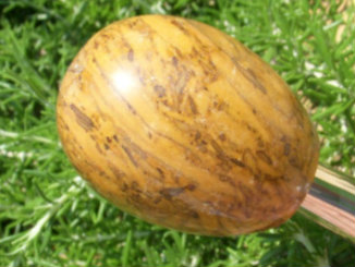 Jasper With Alien Eye, 53mm/2.07" A taxidermy quality glass eye has been inset into the Jasper orb which has an erie, other worldly, alien skin pattern. The eye bulges out a fraction higher to watch over your car for you. It makes a humorous and totaly unique statement. Planet E.T. #1561.........................$125 |