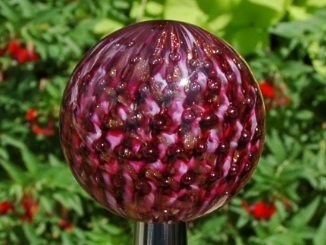Hand Made Glass Art, 57mm/2.25" This work of art was created by a glass artisan and pieces like this are highly sought by collectors. Twisted ribbons of burgundy and copper with rows of precisely spaced, pearly bubbles make a lightshow that sparkles with fire. Planet Pinwheel #1721................$235 |