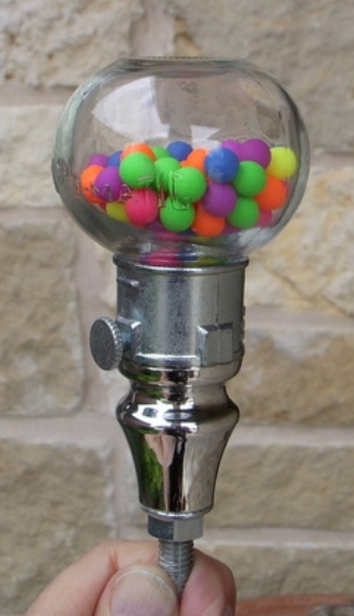 Gumball Machine, 2.48" W x 4.37" T Now here's someting really over the top! At your next car show gathering, this can be the difference between taking home a trophy or taking home a hearty handshake. It's TALL so be sure it won't contact your dashboard, but it's not so huge that it doesn't feel just right in your hand. The real glass globe is 2+1/2" wide. The colored "gumballs" are loose and will bounce around but because they are actually hard rubber so they won't make any noise and you can enjoy quiet shifting and a peaceful ride. Better pack some real gum for kids along for the ride. The thread mount on this one will only fit a 3/8" x 16 shifter lever. It's an exception to my usual master inserts which are adaptable to fit every size. Special Order #A6.........................$179 |