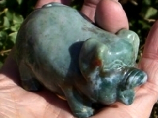 India Agate,1.59 x 1.79 x 3.01" Hand carved in India, from a beautiful seamist, teal-blue gemstone, this little piggy is ready to go to market. It feels suprisingly smooth in hand and can be faced at the driver or away, as you like. I smile everytime I look at it. Huff N Puff.....................................$142 |